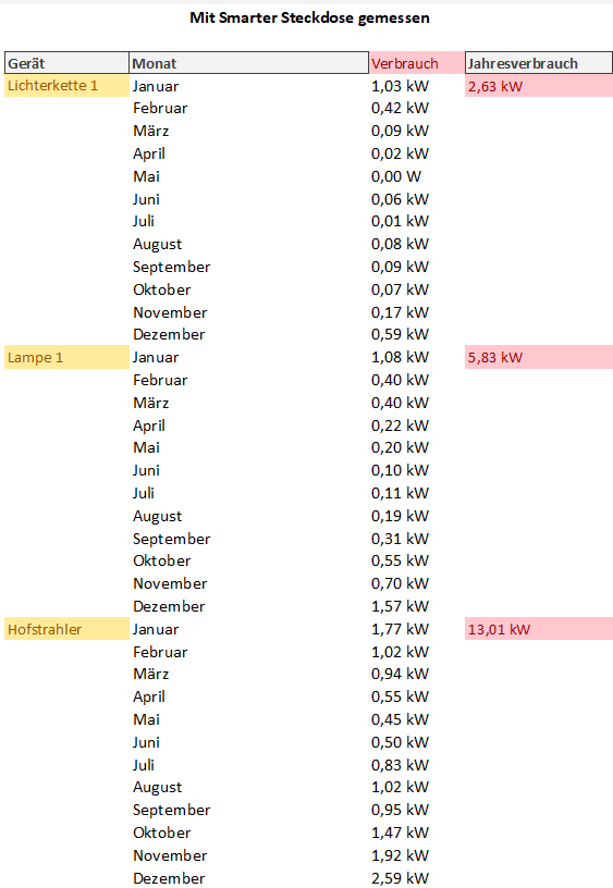 Ein Mitschüler hat sich die Mühe gemacht und mit einer Smarten Steckdose den Jahresverbrauch von drei Elektrogeräten gemessen, hier kommen wir zusammen auf einem Jahresverbrauch von etwa 21 kWh, was pro Jahr fast 10 Euro kostet.