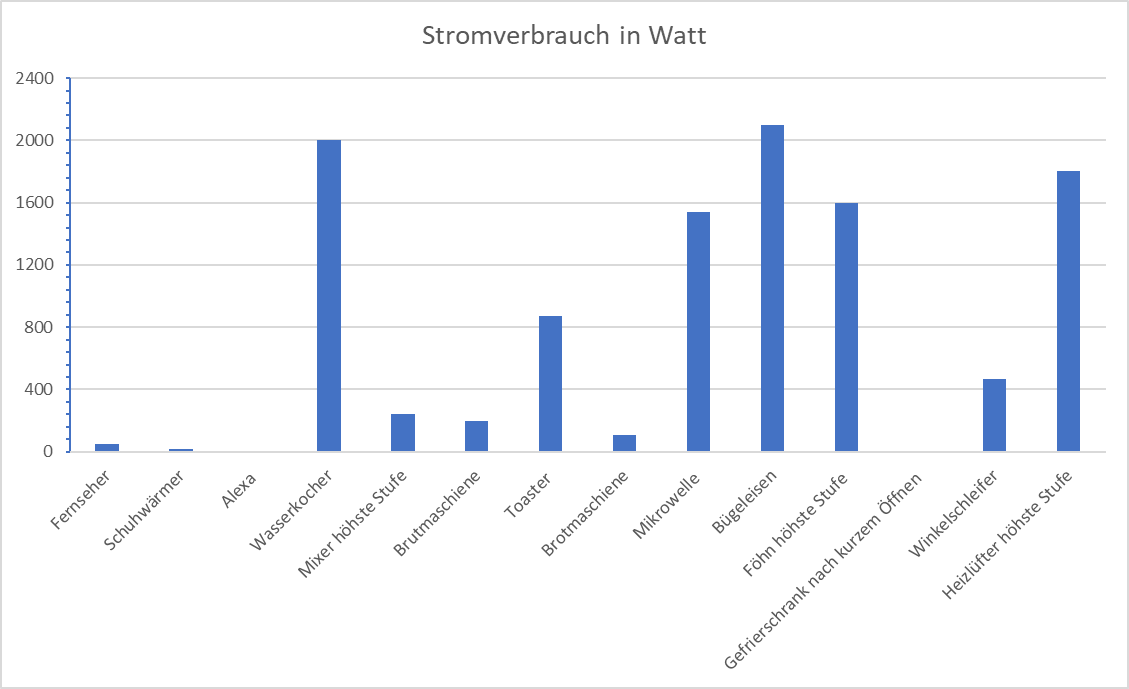 Des Weiteren hat er die Augenblicksleistung verschiedenster Geräte gemessen, einige werden im Balkendiagramm verdeutlicht.