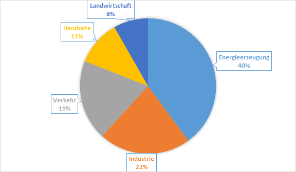 Das Schaubild visualisiert den Gesamtausstoß von COin Prozent in Deutschland. Es ist zu erkennen, dass allein die Energiegewinnung, sowie die Industrie mehr als die Hälfte des gesamten CO2 Ausstoßes verursacht.