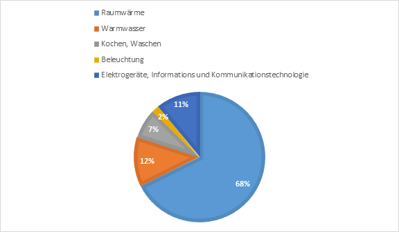 Nun werden wir mal persönlich, denn bei dem Aspekt Haushalt sind wir alle betroffen. Das Diagramm zeigt die prozentuale Aufteilung. Es wird deutlich, dass alleine die Raumwärme fast 70% einnimmt.