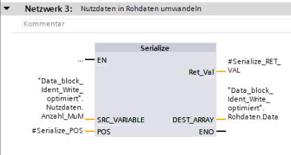 In das Netzwerk 3 wird der Baustein Serialize (ebenfalls aktuellste Version) hinzugefügt, der die Nutzdaten in Rohdaten umgewandelt. Hier werden die Daten, die auf den Transponder geschrieben werden sollen, in ein Format, mit dem der IOL_Write-Block arbeiten kann, übersetzt.