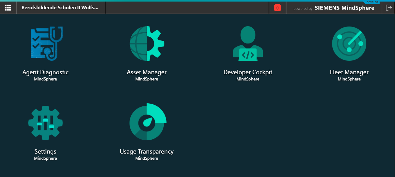 Darunter erscheinen in großen Symbolen die einzelnen Funktionen der MindSphere. Standardmäßig sind die in der Abbildung dargestellten Funktionen vorinstalliert. Auf diese wird auf den folgenden Seiten genauer eingegangen. Allerdings ist es auch möglich, viele weitere Anwendungen zur MindSphere hinzuzufügen (vgl. MindSphere-Applications).