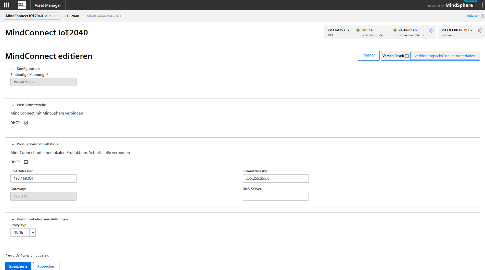 Gehen Sie neben dem Onboarding-Status auf das Zahnrad für die Einstellungen. Sollte ihre Internetverbindung über einen DHCP-Server laufen, aktivieren Sie bei der Web-Schnittstelle den Haken für DHCP. Bei der Produktionsschnittstelle geben Sie für die IP-Adresse die der MIndConnectIoT2040 an. Die Subnetzmaske finden Sie über die cmd-Seite mit dem Befehl "ipconfig" heraus. Der Proxy-Typ wird auf "NONE" gestellt und alles gespeichert. Nun gehen Sie erneut auf das Zahnrad und laden den Verbindungsschlüssel herunter (oben rechts). Ziehen Sie diese Datei auf einen Stick und stecken Sie ihn in die MindConnectIoT2040. Diese führt das Onboarding nun selbstständig durch, sobald dies erfolgreich war ändert sich der Onboarding-Status in der MindSphere auf "Verbunden", hierzu die Seite öfters aktualisieren.