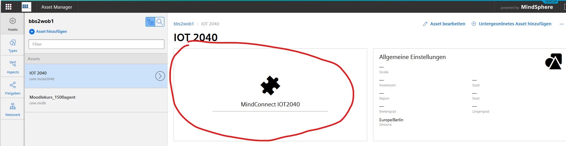 Dort klicken Sie auf den Reiter Assets und dann auf Asset hinzufügen. Es öffnet sich eine Liste mit Types des Assets, aus der Sie den Type "MindConnectIoT2040" auswählen und bestätigen müssen. Anschließend legen Sie einen Namen für das Asset an und speichern dies.