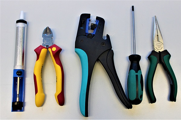 Neben der Lötstation wird noch weiteres Werkzeug benötigt. Zu empfehlen ist ein Seitenschneider zum Kürzen der Anschlüsse von Bauteilen. Außerdem eine Entlötpumpe, falls eine Lötstelle mal daneben geht. Für das Entfernen von Isolierungen der Leitungen ist eine automatische Abisolierzange sinnvoll. Durch einfaches Einstellen können Schäden an den Adern der Leitung vermieden werden. Eine Möglichkeit heiße Bauteile während dem Einlöten zu halten, bietet eine Pinzette oder eine Telefonzange. Zusätzlich ist es immer gut einen 3.5er Schlitzschraubendreher zu haben.