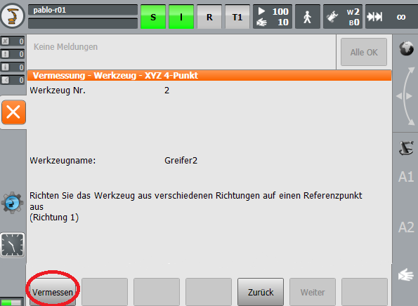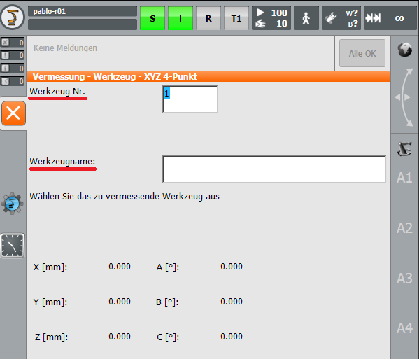 1. Menü: Robotertaste > Inbetriebnahme > Vermessen > Werkzeug > XYZ 4-Punkt