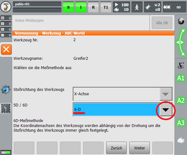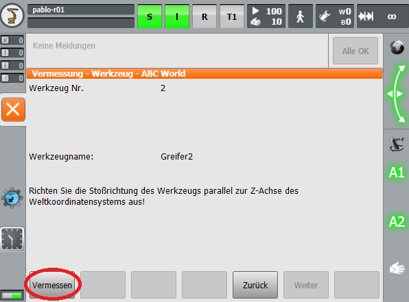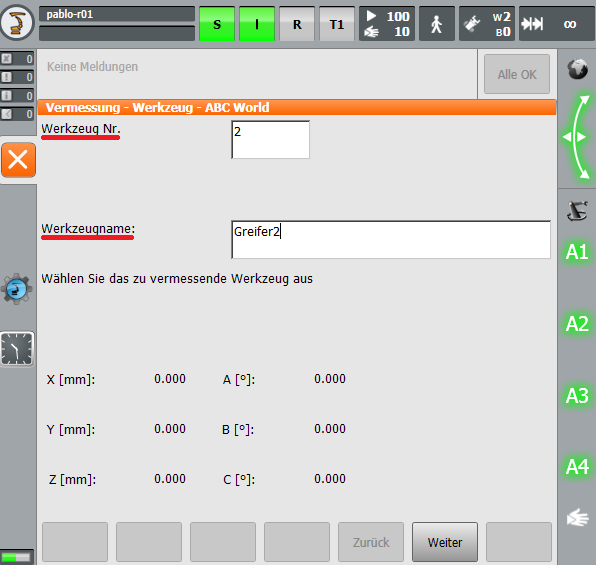 1. Menü: Robotertaste > Inbetriebnahme > Vermessen > Werkzeug > ABC World