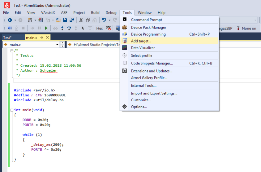 Nach erfolgreichem Verbinden können Sie Atmel Studio starten. Öffnen oder erstellen und compilieren Sie das Projekt, das Sie übertragen wollen. Wie man ein Projekt erstellt, erfahren Sie in dem Kapitel "Erstellen eines neuen Projektes". Wählen Sie unter dem Reiter "Tools" die Einstellung "Add target..."