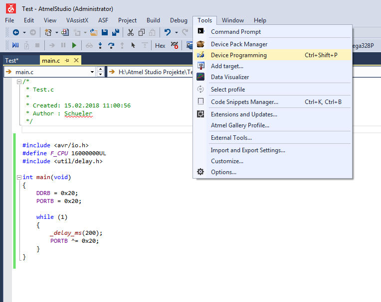 Nun wählen Sie unter dem Reiter "Tools" die Einstellung "Device Programming".