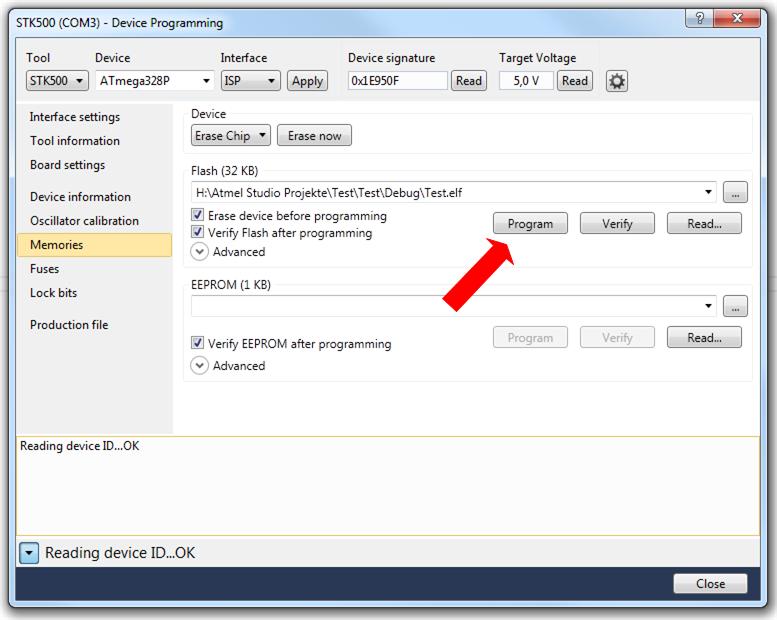 Wählen Sie als nächstes unter "Device signature" den Button "Read" aus. Erscheint im unteren Ausgabefenster "Reading device ID...OK" , ist der Programmer bereit Programme auf den Arduino zu brennen.