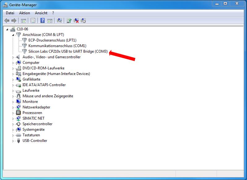 Wenn Sie den Port nicht wissen, schauen Sie im Geräte-Manager nach. Der verwendete Port steht in Klammern hinter dem Programmer (in diesem Fall COM3).