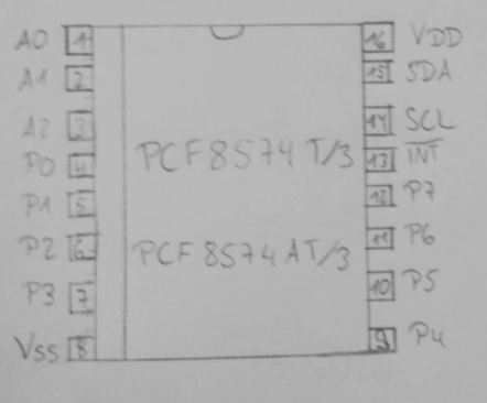 Der PCF8574A ist ein I²C 8-Bit I/O Port Expander. Die serielle Schnittstelle I²C wurde bereits in einem vorherigen Kapitel behandelt. Der Port Expander wandelt die seriell (über den Bus) übertragenen Signale auf eine parallele Übertragung um. Um den Port-Expander via I²C ansprechen zu können, benötigt dieser eine feste Adresse. Diese kann an den Adresspins A0, A1 und A2 begrenzt definiert werden. Dazu werden die Pins auf High oder Low gelegt. Welche Adressen zu welcher Konfiguration gehören, kann dem Datenblatt entnommen werden. P0 bis P7 sind die parallelen Ausgänge. GND und Vcc dienen der Spannungsversorgung des Expanders sowie des Displays und werden wie SDA und SCL mit dem Arduino verbunden. SDA und SCL sind die bereits bekannten I²C-typischen Leitungen.