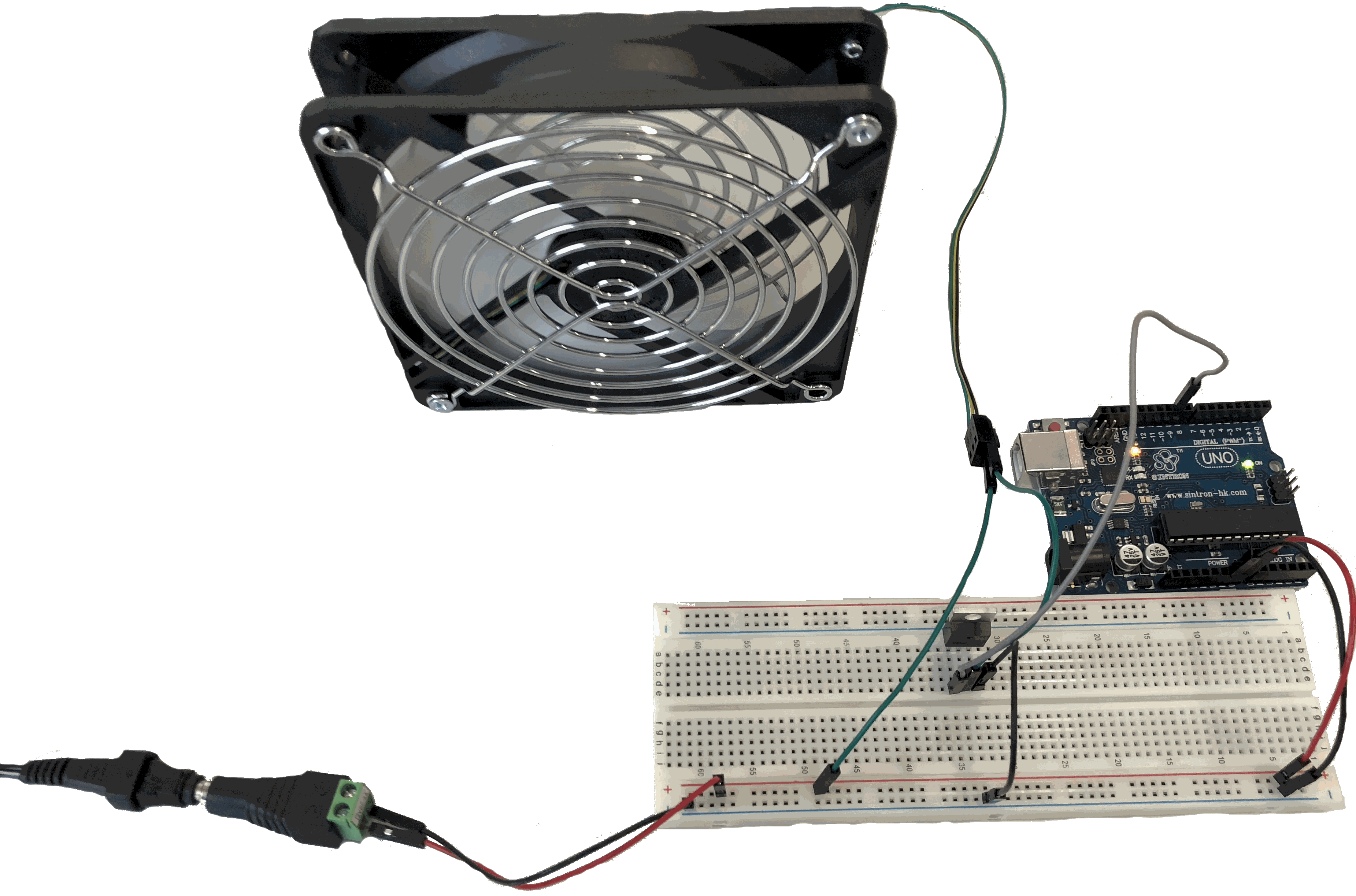 In diesem Kapitel wird mittels PWM ein PC-Gehäuse-Lüfter angesteuert. Durch die Pulsweitenmodulation ist es möglich, den Lüfter auf unterschiedlichen Geschwindigkeiten rotieren zu lassen. Da die meisten PC Lüfter auf 12V Basis operieren, der Arduino aber nur 5V zur Verfügung stellt, ist es notwendig, ein externes Netzteil für den Lüfter und den Arduino zu verwenden. Um den Lüfter mittels PWM und 12V zu versorgen, kommt ein Mosfet (IRLZ 34N) zum Einsatz. Der Aufbau sieht wie folgt aus: