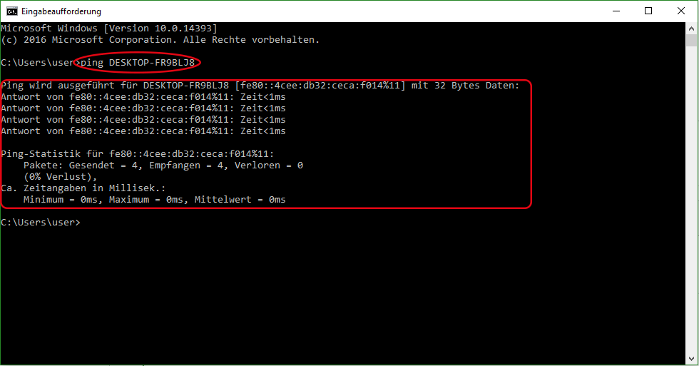 - Wenn Sie ihre IP-Adresse wissen, geben Sie den Befehl "ping" und mit einem Leerzeichen getrennt die IPv4-Adresse ein.
