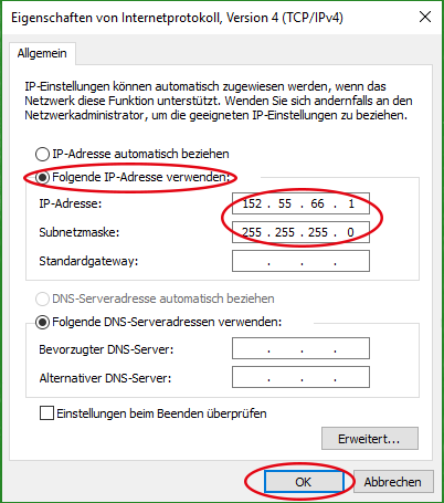 - "Folgende IP-Adresse verwenden" auswählen und IP-Adresse und Subnetzmaske festlegen.