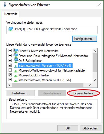 - Internetprotokoll Version 4 auswählen und auf Eigenschaften klicken.