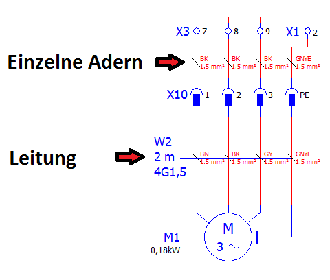 Hier ein Beispiel, wie Leitungen in Schaltplänen gekennzeichnet werden: