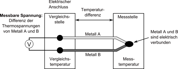 Das Thermoelement ist genauso aufgebaut wie in der oben gezeigten Grafik. Zwei verschiedene Leiter werden an einem Ende zusammen geführt und am anderen Ende wird die durch den Seebeck-Effekt entstehende Spannung gemessen. Diese Spannung wird bei einer Temperaturmessung über verschiedene elektronische Bauteile z.B. zu einer SPS geführt. Dort kann das Signal verarbeitet werden und als Ausgang z.B. die gemessene Temepratur anzeigen.