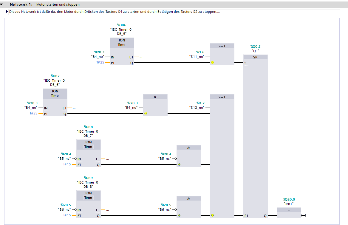 Dafür werden bei dem ODER-Gatter zwei weitere Eingänge eingefügt, an die wiederrum jeweils ein UND-Gatter herangesetzt wird. Bei diesen beiden wird jeweils der Eingang negiert, an denen, wie im Bild zu sehen, B6 und B5 eingefügt werden. An beiden anderen Eingängen von den UND-Gattern kommt jeweils ein Timer für die Einschaltverzögerung (TON). Die Eingänge werden, wie dem Bild zu entnehmen, gesetzt.