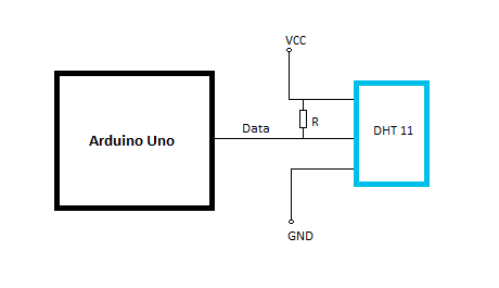 Der digitale Sensor ist in der Lage sowohl die Temperatur in Grad Celsius sowie die relative Luftfeuchtigkeit in Prozent zu messen. Im Unterschied zu den zuvor behandelten Sensoren, benötigt jeder Sensor dieses Typs eine eigene Datenleitung. Eine Kommunikation mehrer Sensoren über den One Wire Bus ist also nicht möglich. Die Gemeinsamkeit ist allerdings, dass der DHT11 auch nur drei Pins benötigt. Zwei Pins für die Spannungsversorgung und einen zum Anschluss der Datenleitung. Die Pinbelegung des Sensors ist in der folgenden Abbildung dargestellt: