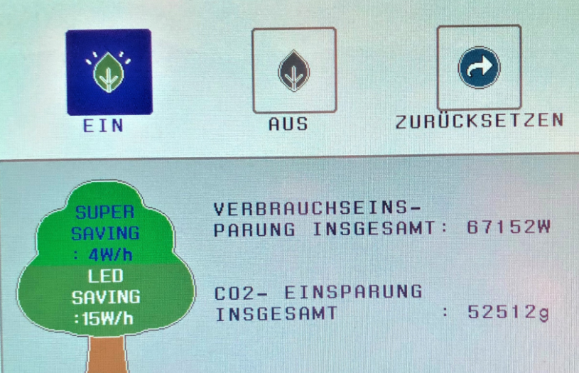 Die Daten wurden von einem hauseigenen PC-Bildschirm aufgenommen (LG FLATRON E2251T-BN). Über das Bildschirm-Menü ist es möglich, den Energiesparmodus aufzurufen und sich die entsprechenden Daten anzeigen zu lassen. Nach einiger Zeit wird sich eine erstaunliche Ersparnis bemerkbar machen, zumal keine Einschränkung während des Gebrauchs zu verspüren ist (beispielsweise eingeschränkte Helligkeit). In diesem Beispiel wurden mit dem getesteten Monitor im Laufe seiner Lebenszeit rund 67 kWh an Energie eingespart und damit wurden 52 kg weniger CO2 ausgestoßen.