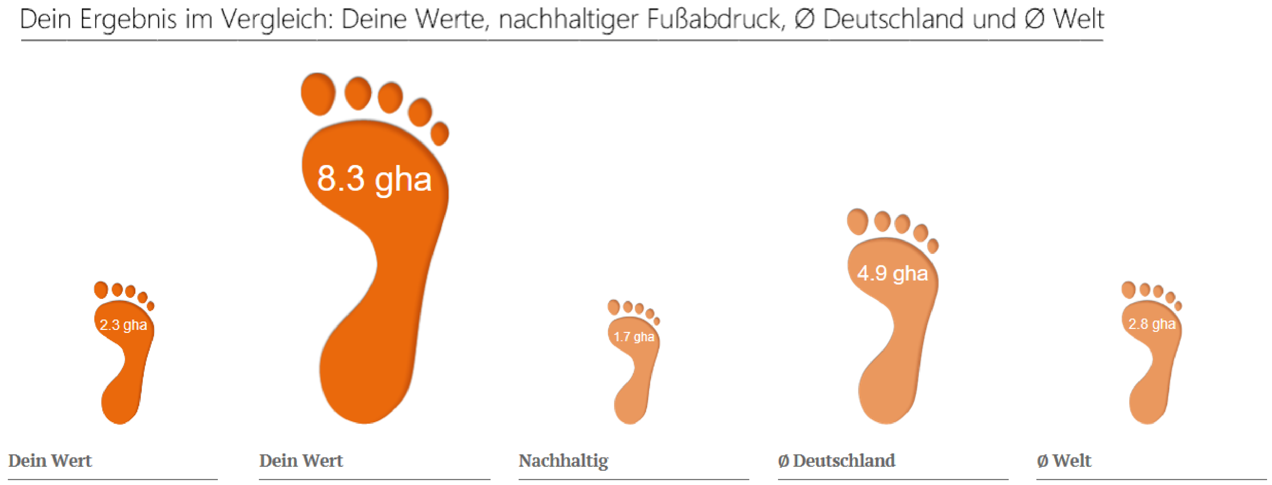 Auf der Seite www.fussabdruck.de, die von der Organisation "Brot für die Welt" entwickelt wurde, hat jeder die Möglichkeit seinen eigenen ökologischen Fußabdruck herauszufinden und findet außerdem Tipps, um einen möglicherweise erhöhten Fußabdruck zu senken. Später verlinken wir Ihnen die Seite und regen zum Teilen des Ergebnisses an. Wir, als Ersteller dieses Kurses, haben den Fußabdrucktest mit zwei sehr unterschiedlichen Lebensweisen durchgeführt und kamen auf erstaunliche Ergebnisse: