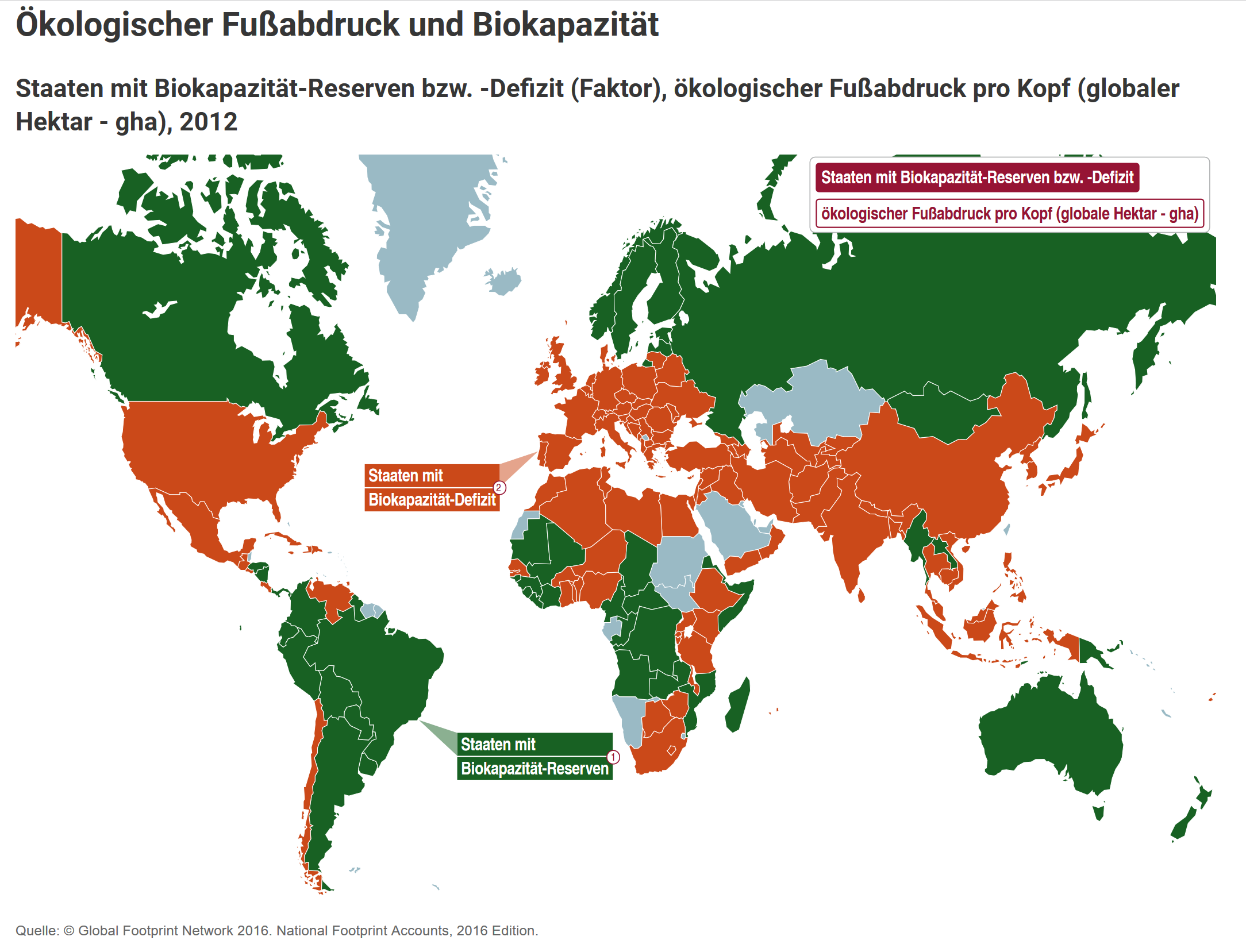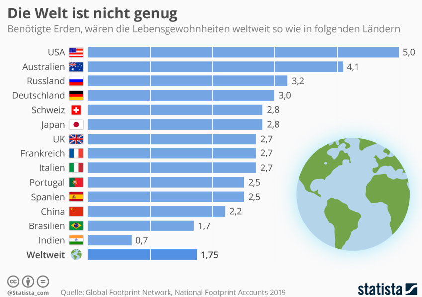 Diese Grafik veranschaulicht, wie viele Erden notwendig sind, wenn die Weltbevölkerung so leben würde, wie die Menschen in den jeweiligen Staaten.