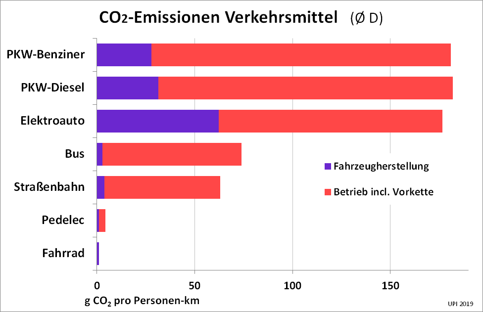 In der Grafik des UPI lässt sich erkennen, dass die Herstellung von Elektroautos, sogar noch mehr CO2 freisetzt, wie die eines Verbrenners. Deshalb ist die Illusion des umweltfreundlichen Fahrens mit elektrischen Fahrzeugen auch mit Herausforderungen verbunden. Die umweltfreundlichsten Fortbewegungsmethoden, die zum einen den Geldbeutel schonen, aber auch die Fitness verbessern, sind Fahrrad und  E-Bike/Pedelec ( Pedal Electric Cycle), wobei natürlich bedacht werden muss, dass die Speisung der Fahrrad-Akkus auch mit Umweltbelastung verbunden ist.