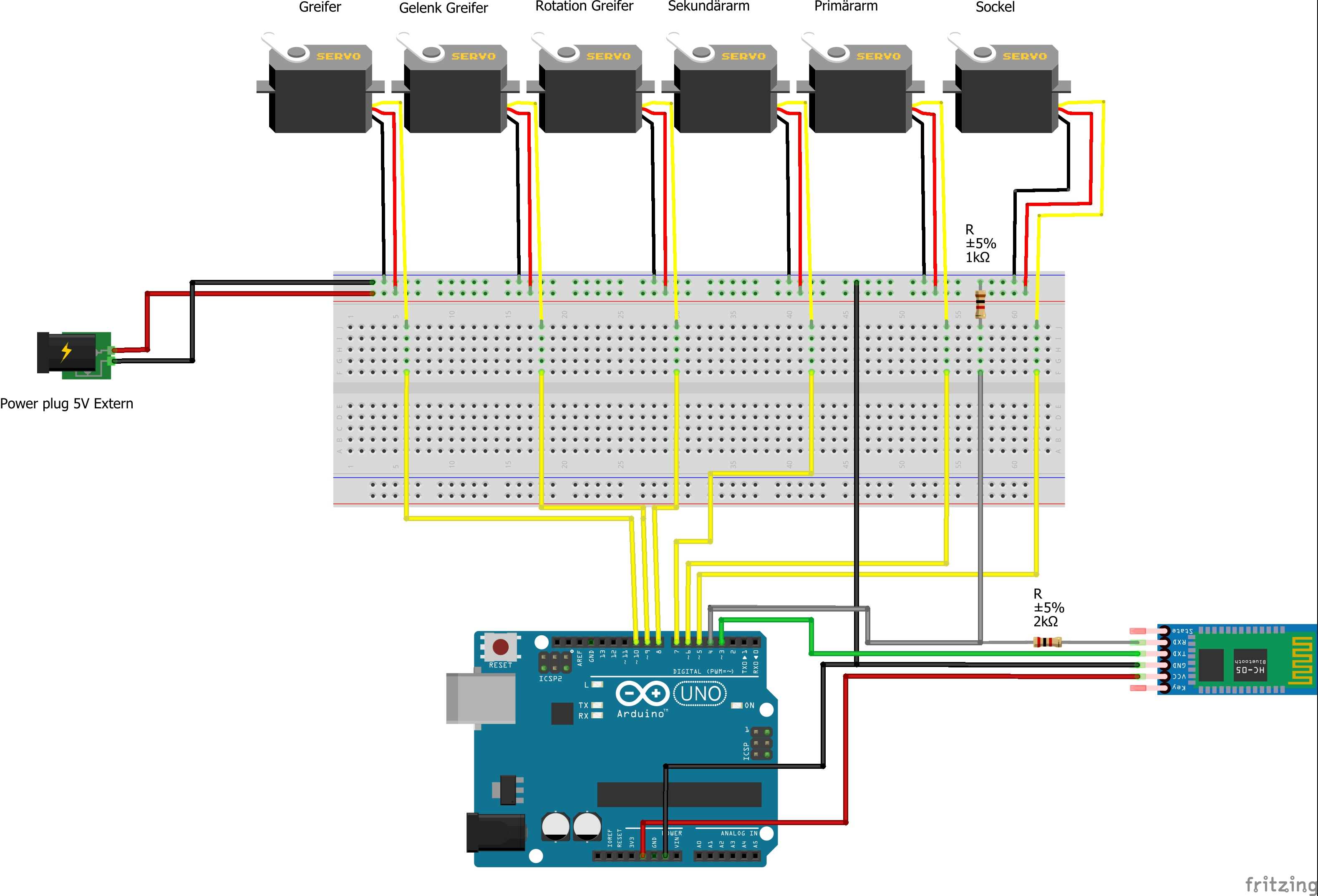 Nun ist der Roboter bereits aufgebaut, jedoch fehlen die Stromversorgung und die Ansteuerung. Dazu werden zunächst die Servos über eine externe Stromquelle (z.B Labornetzteil) mit 5V versorgt, wobei es sehr wichtig ist polaritätsrichtig zu arbeiten. Dafür müssen die mittleren, roten Leitung der Servos jeweils an Plus und jeweils die Dunkleren der beiden anderen Leitungen an Minus angeschlossen werden.