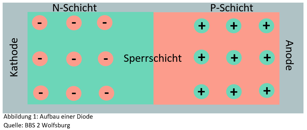 Dioden bestehen aus Halbleitern. mit zwei Schichten. In jede Schicht werden gezielt Fremdatome eingebracht (man spricht von Dotierung), die die Eigenschaft der Schicht beeinflussen. Bei einer Dotierung gibt es zwei verschiedene Arten: die n-Dotierung bei der Atome mit mehr Außenelektronen hinzugefügt werden und die p-Dotierung bei welcher Materialien mit weniger Außenelektronen hinzugefügt werden. Die Diode hat jeweils eine n-dotierte Schicht (Anode) und einer p-dotierte (Kathode) Seite. An der Stelle, wo die beiden Schichten sich treffen, entsteht eine Sperrschicht, welche die Elektronen und positiven Ladungsträger zunächst nicht überqueren können.