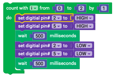 | Innerhalb der for-Schleife müssen die Alarmpins auf "High" gesetzt werden und dort für eine bestimmte Zeit gehalten werden. Mit dem Funktionsaufruf "delay()" wird das Programm im aktuellen Zustand für die angegebene Zeit gehalten. Beispielsweise würde bei "delay(500)" das Programm für 500 ms gehalten werden. Mit der Funktion "digitalWrite(alarmLED,HIGH);" wird der Alarmpin der LED auf "High" gesetzt. | Unter dem Block "do" sollen nun die Pins für die LED und den Buzzer auf "High" gesetzt werden. Dieser Zustand soll für 500 ms gehalten werden. Anschließend werden die Pins wieder auf "Low" gesetzt und 500 ms der Zustand gehalten. | |