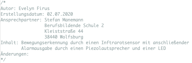 | Am Anfang jedes Quellendes sind die Autoren, Ansprechpartner mit Kontaktangaben, Erstellungsdatum und eine Beschreibung der Funktion des Codes aufgeführt. Wenn mehrere Personen am gleichen Code arbeiten, sollten Änderungen ebenfalls als Kommentar eingefügt werden. Dabei soll beschreiben, wer wann und was geändert hat. Um ganze Blöcke auskommentieren zu können, werden die Zeichen "/*" am Anfang des Blocks und "*/" am Ende des Blockes eingefügt. |