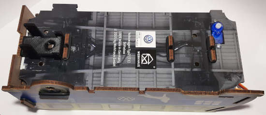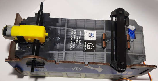 Habt ihr die Hürden bis jetzt gemeistert, steckt ihr eine Achse in die befestigte Seitenverkleidung des T1 und könnt nun den Motor eindrücken. Wenn ihr die Achse vergesst, müsst ihr die ganze Seite auch nochmal auseinanderbauen. Final sollte es wie in der folgenden Abbildung aussehen.