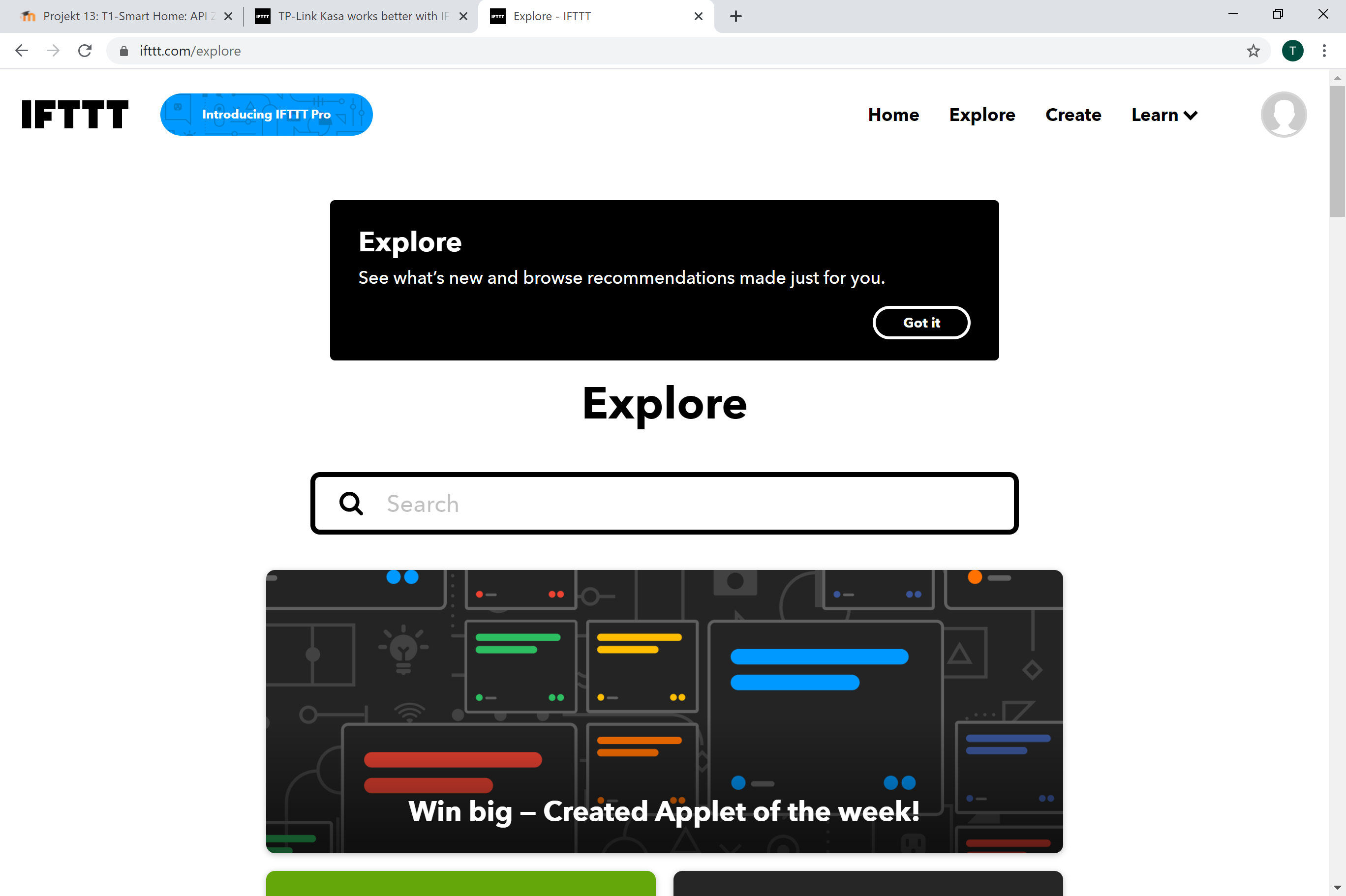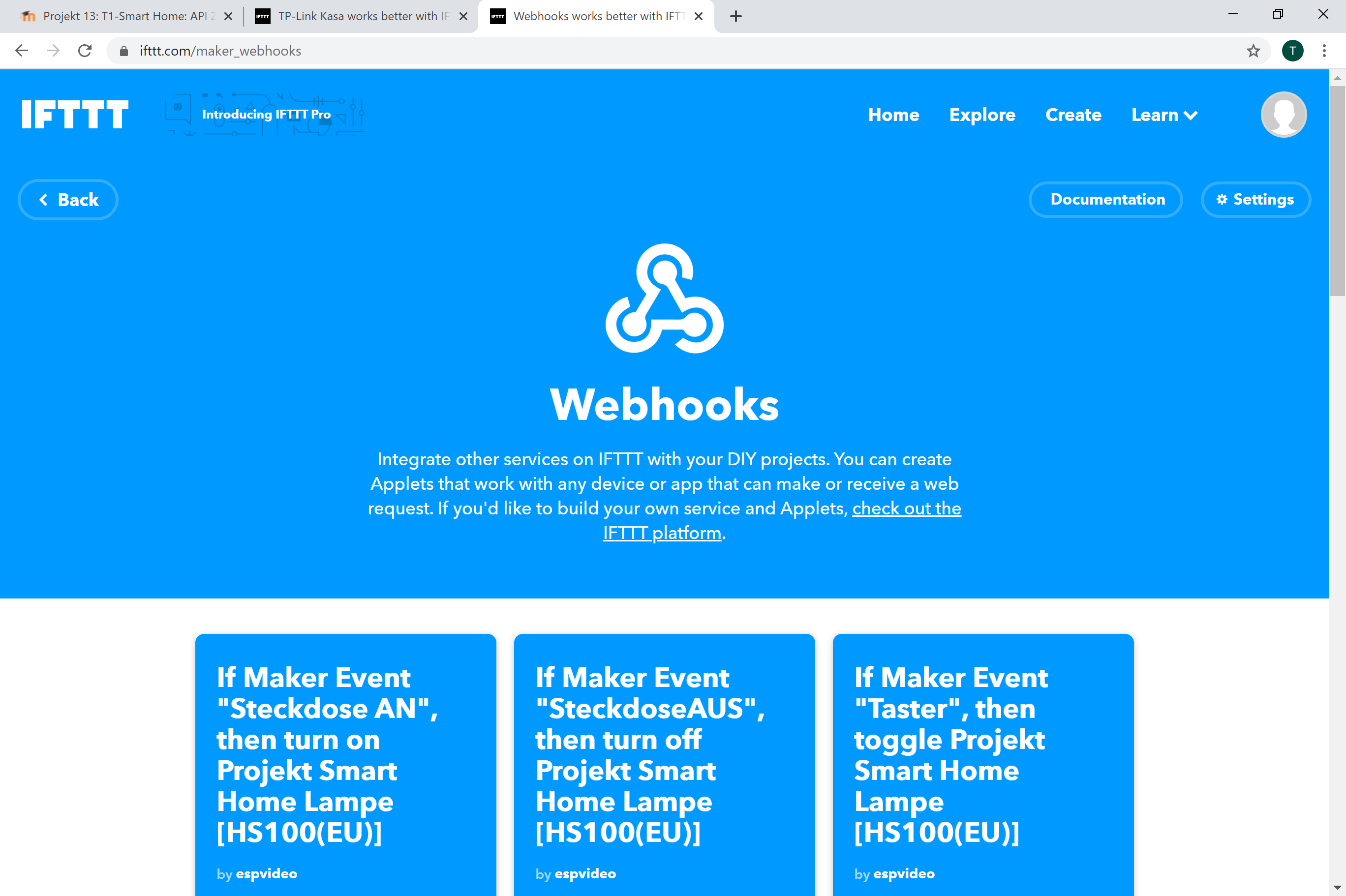 Auf der folgenden Seite wollen wir nun zeigen, über welche Webadresse man die Steckdose steuern kann. IFTTT erstellt für jedes Konto und jeden Webhook eine separate Adresse, mit welcher die Aktion ausführbar ist. Zunächst zeigen wir euch, wie man dort hinkommt.