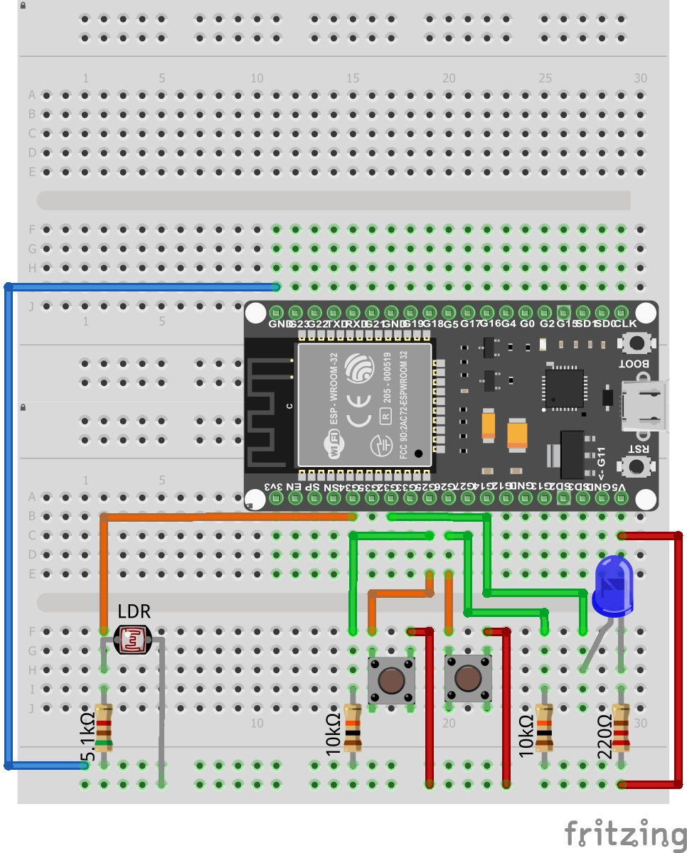 Der LDR wird von der Plus-Leiste mit Leiste 4 verbunden, von welcher die Verbindung zum GPIO34 hergestellt wird. Ein 5,1 kΩ-Widerstand verbindet Leiste 4 mit der Minus-Leiste.