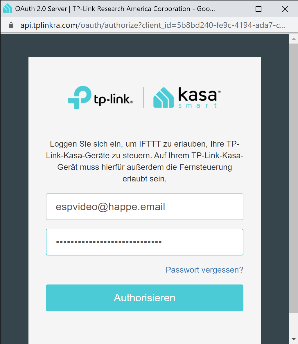 3. Nun baut IFTTT Kontakt zu eurem Konto bei TP-Link Kasa auf. Es ist daher zwingend erforderlich, dass ihr bei Kasa ein Konto eingerichtet habt. Ihr meldet euch nun also mit euren Daten an, welche ihr schon beim Eichrichten der Steckdose verwendet habt. Damit gestattet ihr IFTTT den Zugriff auf eure Geräte. Nur so ist es möglich die Steckdose zu Bedienen. Nachdem ihr eure Daten eingegeben habt, klickt ihr auf "Authorisieren"