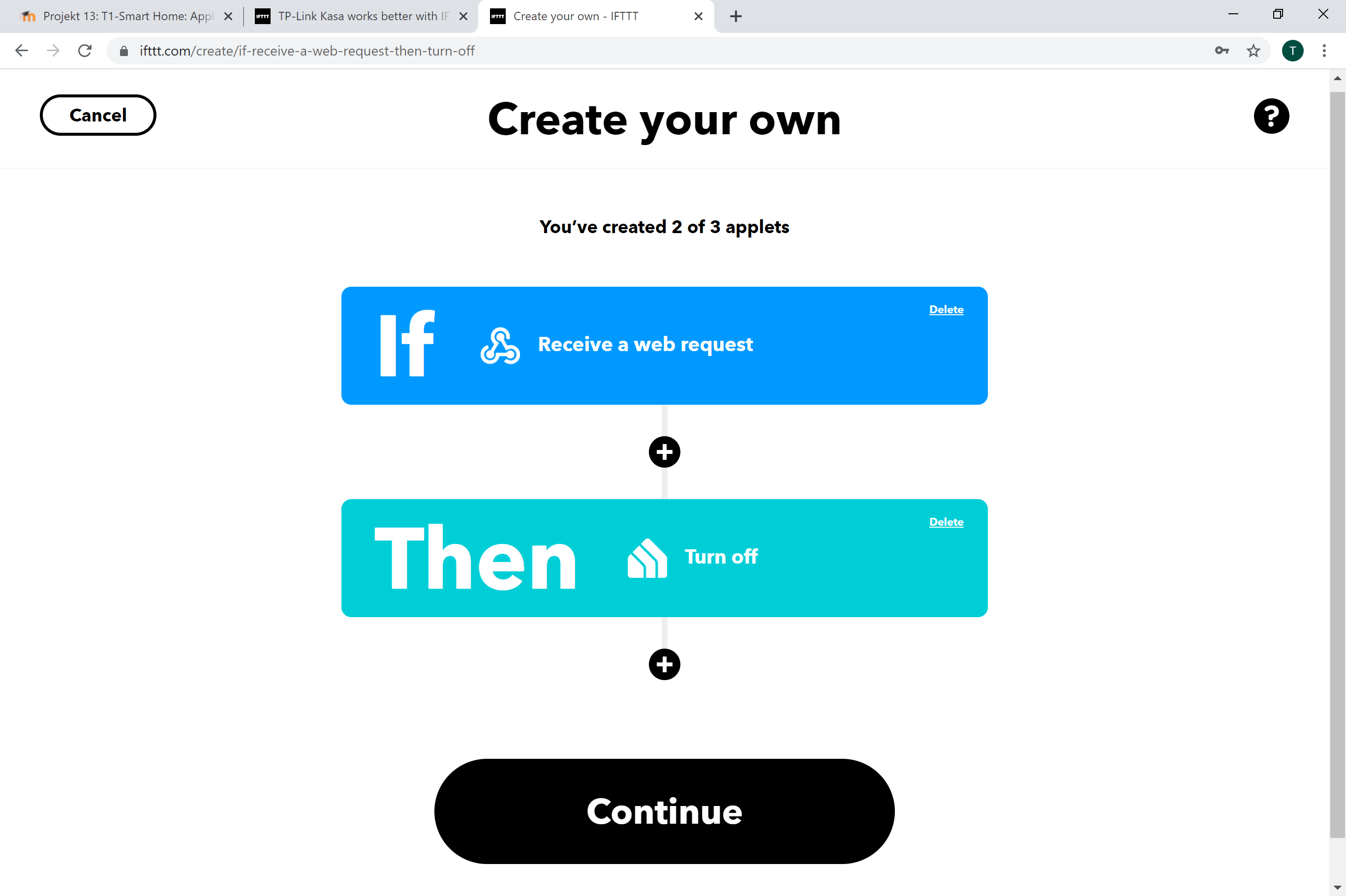 6. Zuletzt erscheint nun noch einmal der Grundbildschirm der Verknüpfung und ihr könnt sehen, dass nun der Auslöser und die Folge beide ausgefüllt sind. Wenn beides wie hier dargestellt aussieht, geht ihr auf "Continue" .