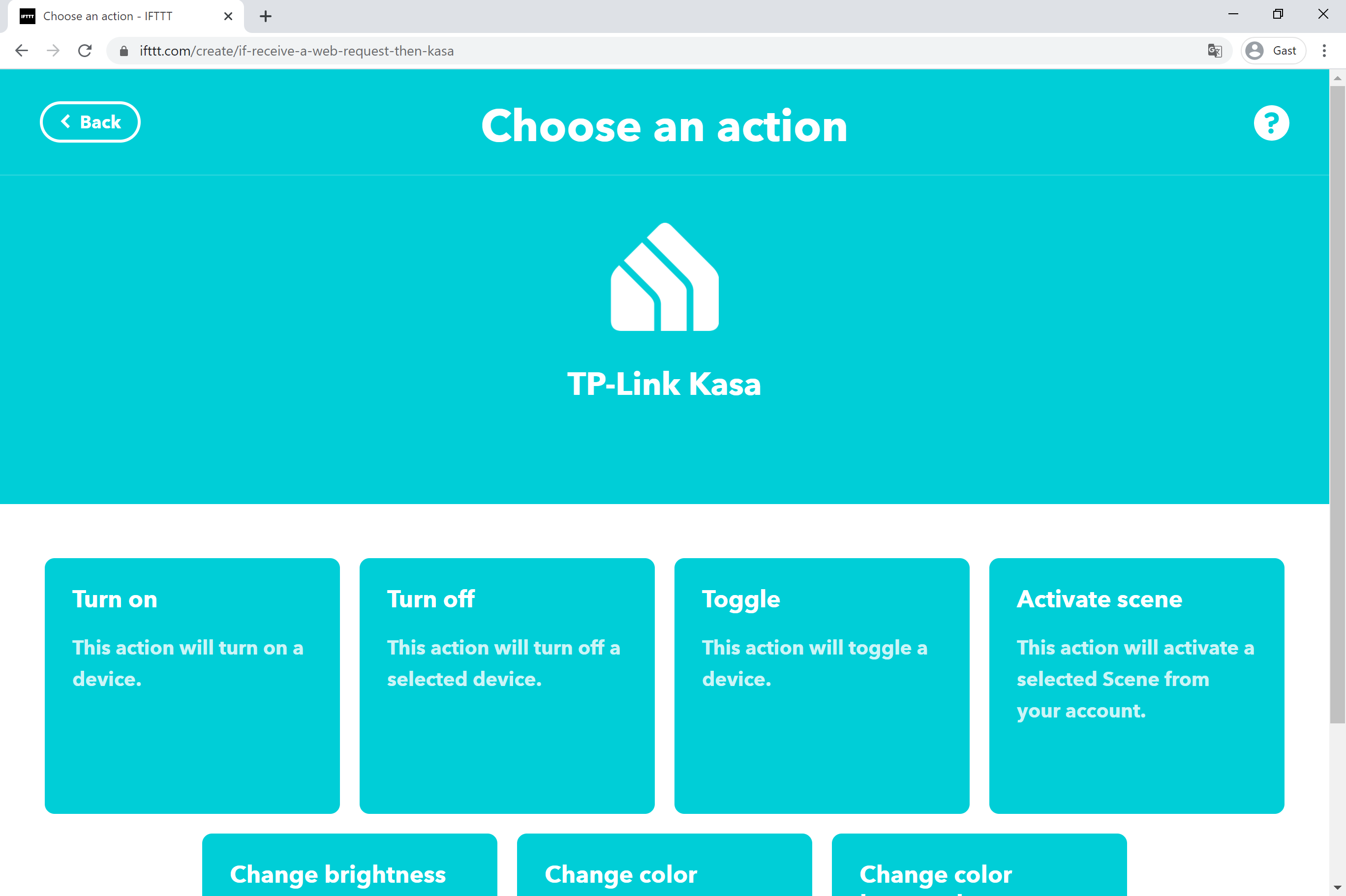 4. Es erscheint die Aktionsseite von Kasa. Hier sind alle Services aufgezählt, welche möglich sind. Neben einfachen An- und Ausbefehlen gibt es zum Beispiel auch einen Toggle-Modus, oder für smarte Glühbirnen Helligkeitseinstellungen. Wir wollen jetzt einen Einschaltvorgang realisieren und wählen "Turn On"