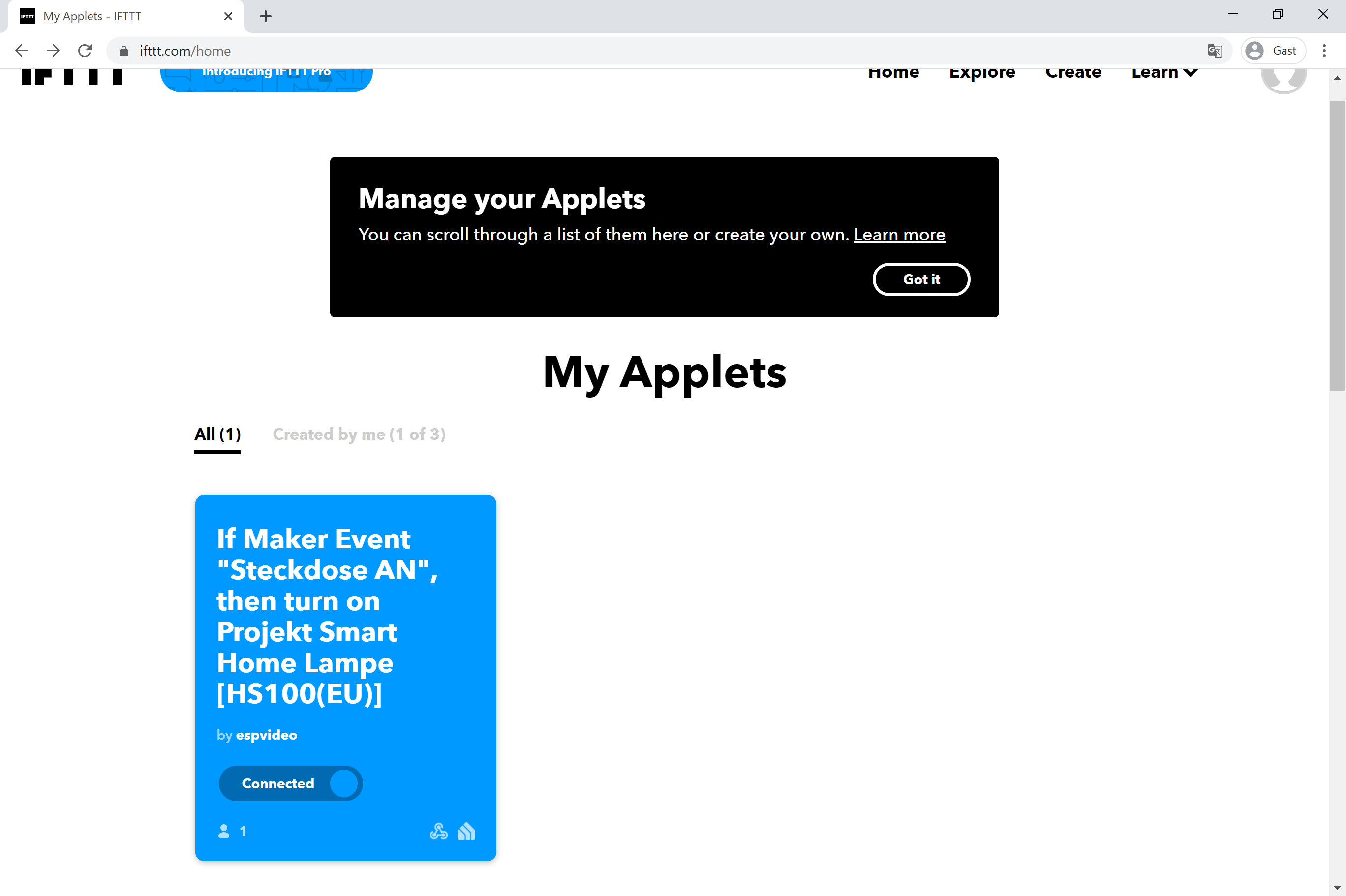 7. Ihr habt es geschafft und euer erstes eigenes Applet bei IFTTT erstellt! :)