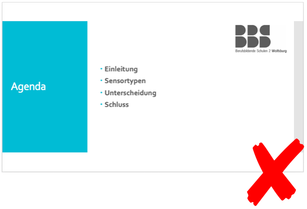 | Abbildung: Beispiel für eine gute Inhaltsfolie | Abbildung: Beispiel für eine schlechte Inhaltsfolie |