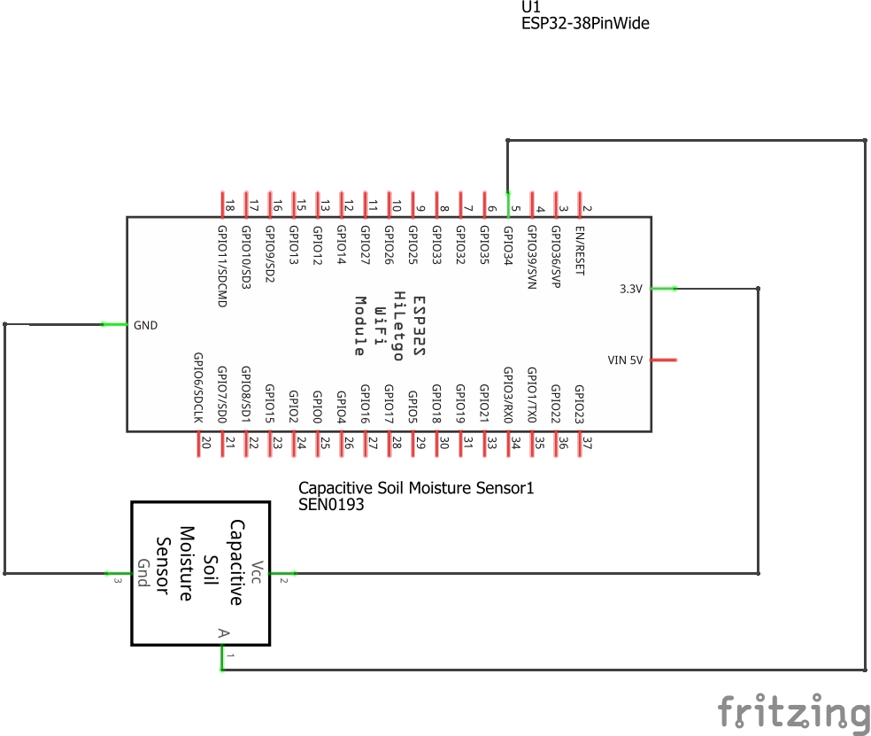 In diesem Fall wird der analoge Pin "AU0T" des Bodenfeuchtigkeitssensor mit dem analogen Eingangspin G34 des ESP32 verbunden.