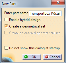 Wir wollen ein neues Bauteil in dem CAD-Programm erstellen, weshalb wir in diesem Fenster die Auswahl „Part“ treffen. Nun wirst du aufgefordert, dem neuen Bauteil einen Namen zuzuweisen. Hier wählen wir den Namen „Transportbox_Kürzel“