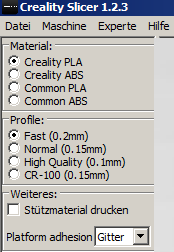 Wenn es benötigt wird, kann außerdem der Druck von Stützmaterial aktiviert werden. Damit der Druck später nicht an der Bodenplatte festklebt, druckt der Creality eine Plattform für das Werkstück. In den Einstellungen kann die Struktur dieser Plattform eingestellt werden.