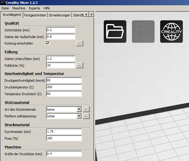 Nach dem Öffnen des Programms erscheint der Druckraum des Creality. Dieser ist zunächst noch leer und kann jetzt mit den zu druckenden Teilen befüllt werden. Dafür muss der Button "Laden", auf dem ein Ordner abgebildet ist, ausgewählt werden.
