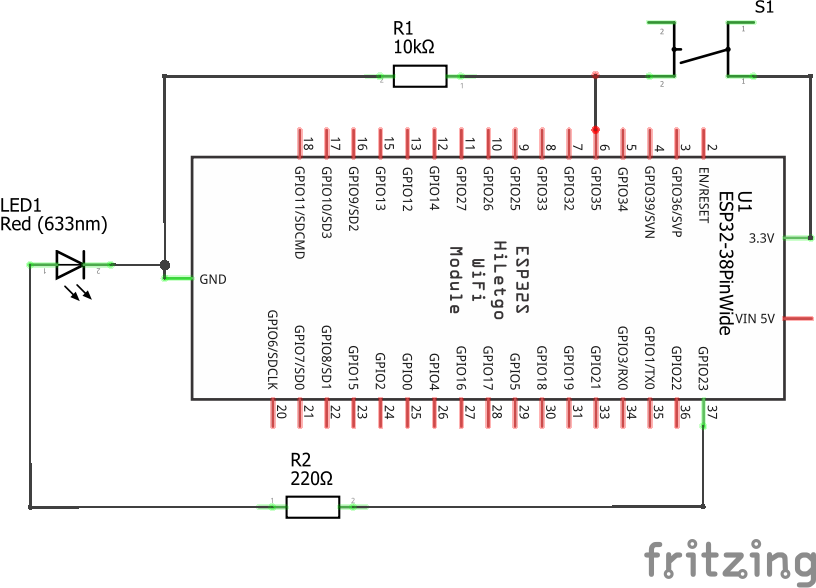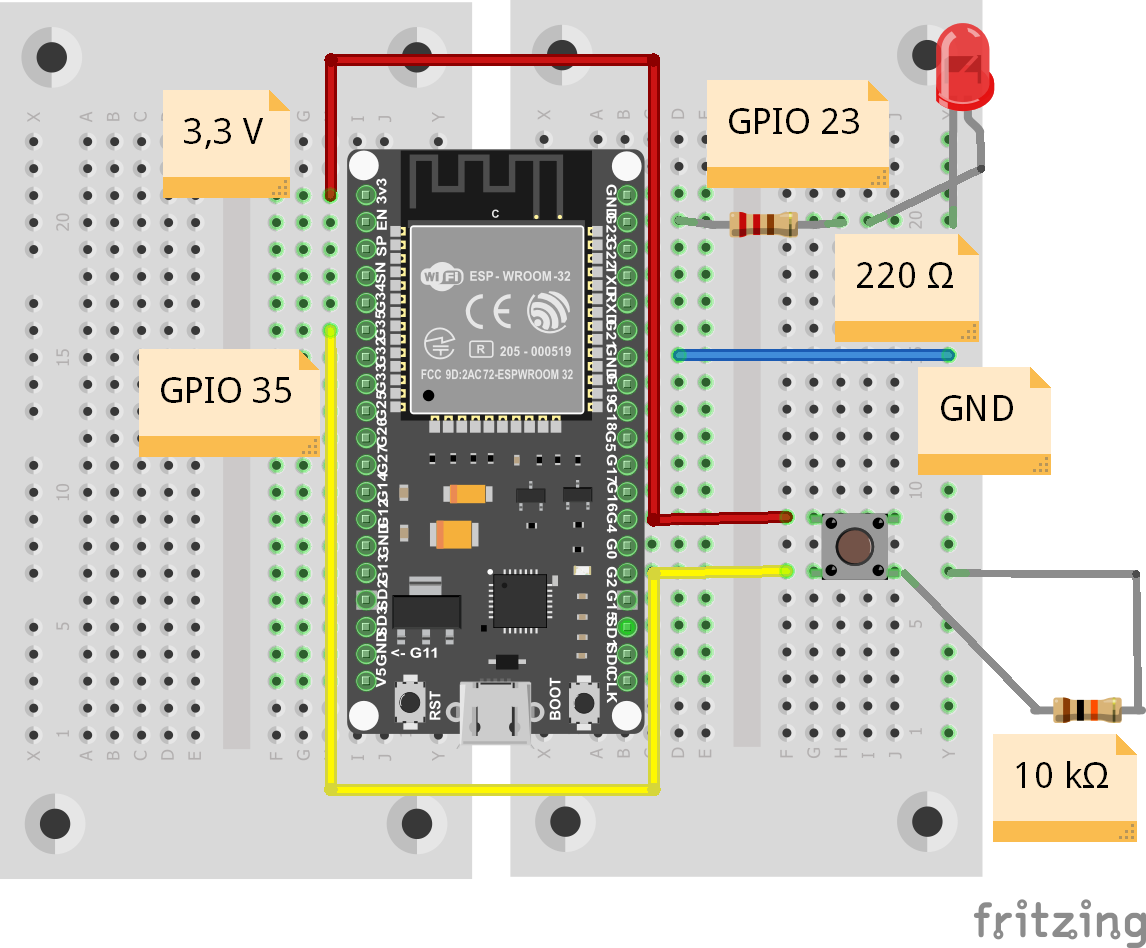 Abbildungen: LED mit Widerstand und Taster am ESP32 - Steckplatine