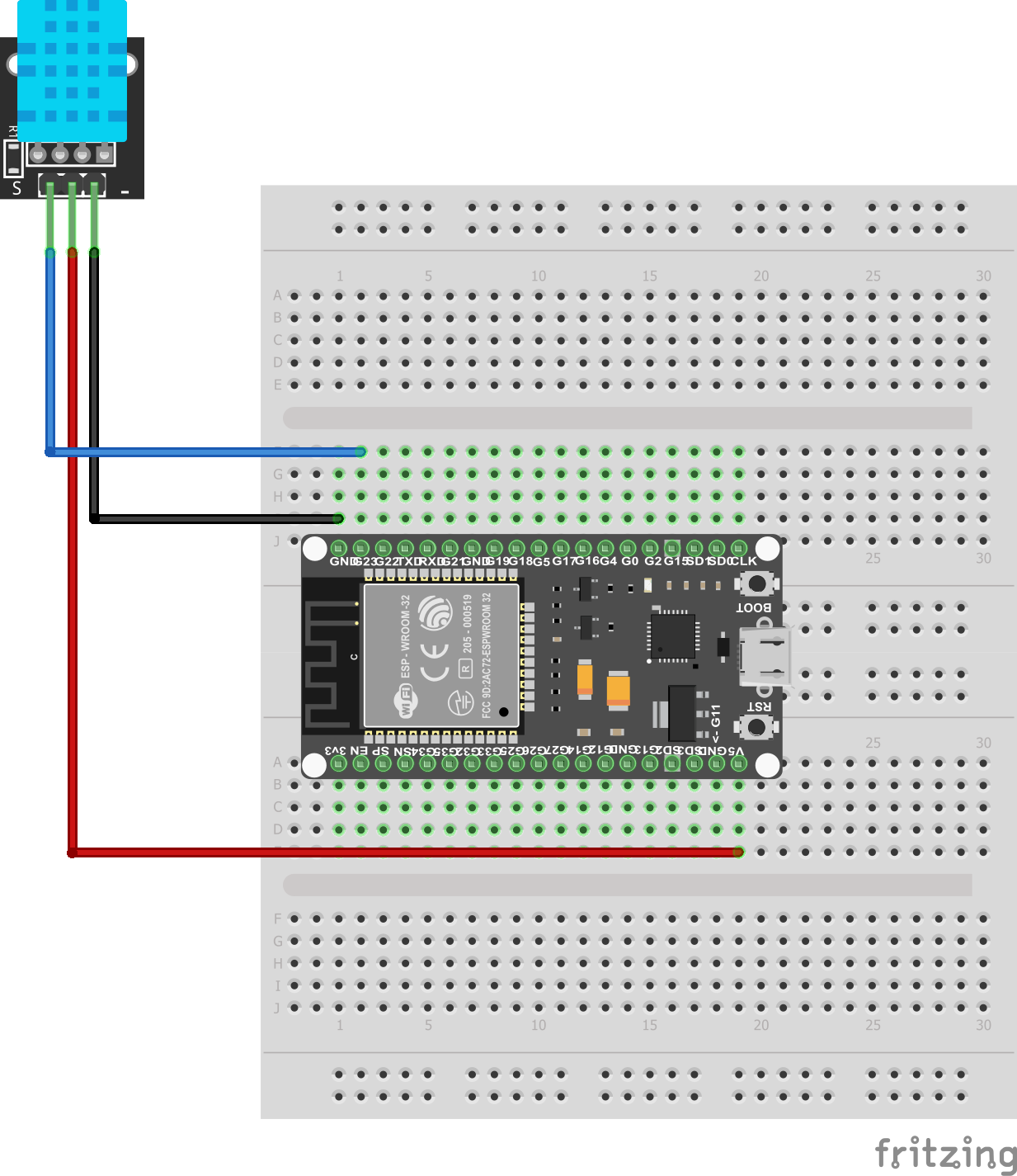Kann zum Beispiel verwendet werden um die Temperatur und Feuchtigkeit im Raum zu messen. Dazu muss der Sensor wie folgt an eine ESP32 angeschlossen und programmiert werden: