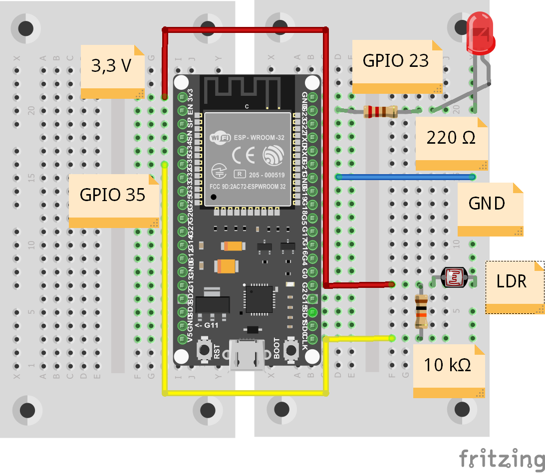 Abbildungen: LED mit Widerstand und LDR am ESP32 - Steckplatine