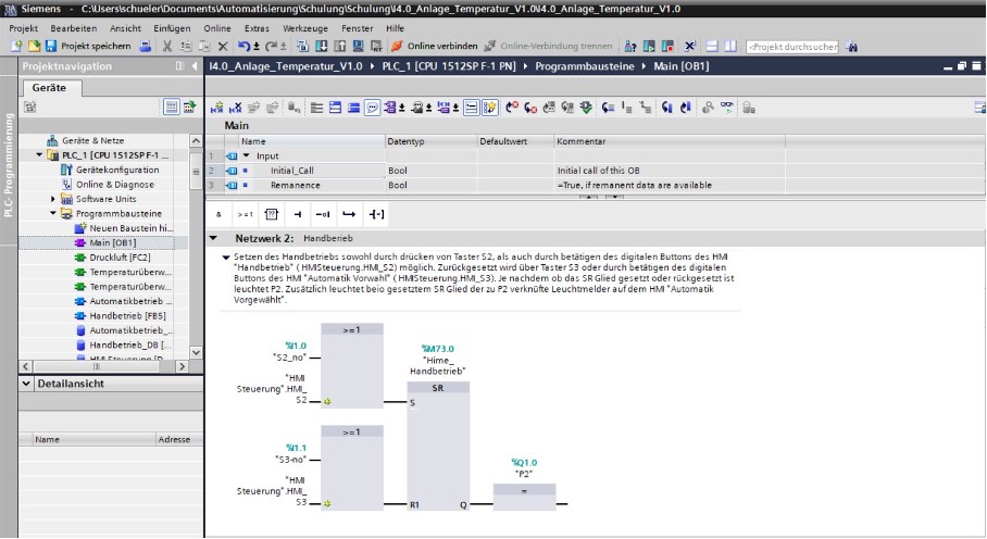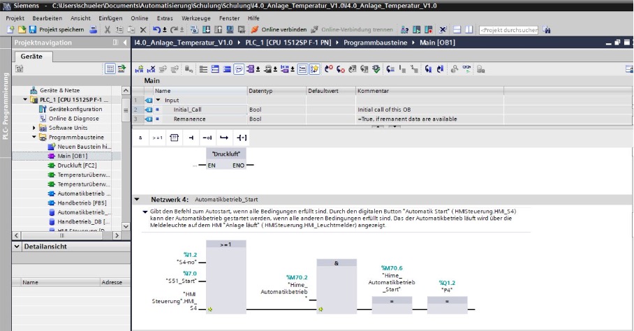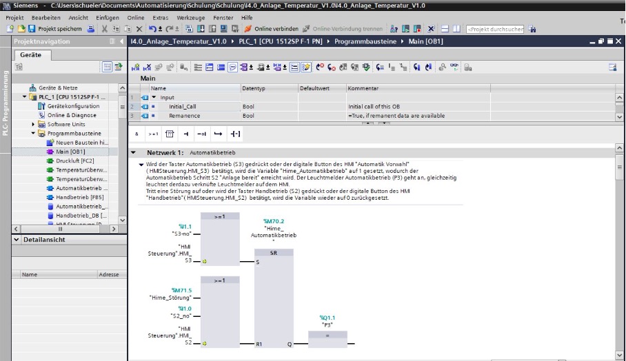 Für den Anfang wird der Main Baustein angepasst. Dieser enthält vor allem die Leuchtmelder. Diese sollen auch durch die neuen Variablen angesteuert werden. Hierfür wird das jeweilige Netzwerk betrachtet, anschließend wird an jeden Baustein, der durch die jeweilige Variabel (z.B. S3-no) angesteuert wird, ein ODER Baustein hinzugefügt an den nun neben der ursprüngliche Variable (z.B. S3-no) zusätzlich noch die analog dazu, im Datenbaustein angelegte Variable (z.B. HMI Steuerung.HMI_S3) hinzugefügt wird. Dies wird für die Variablen S2, S3 und S4 durchgeführt. (siehe Bilder)