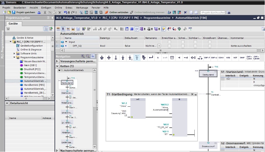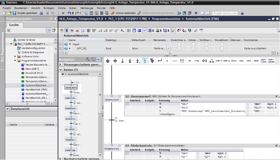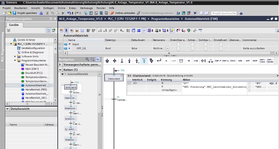 Wie bereits erwähnt soll eine neue Funktion im Schrittkettenprogramm integriert werden, mit der der neu erstellte Leuchtmelder auf der Touchpaneloberfläche dauerhaft leuchtet, solange wie der Automatikbetrieb läuft. Hierzu wird der FB4 (Funktionsbaustein Automatikbetrieb) verändert. Dieser wurde in Schrittkettenschreibweise mit GrafCET programmiert.