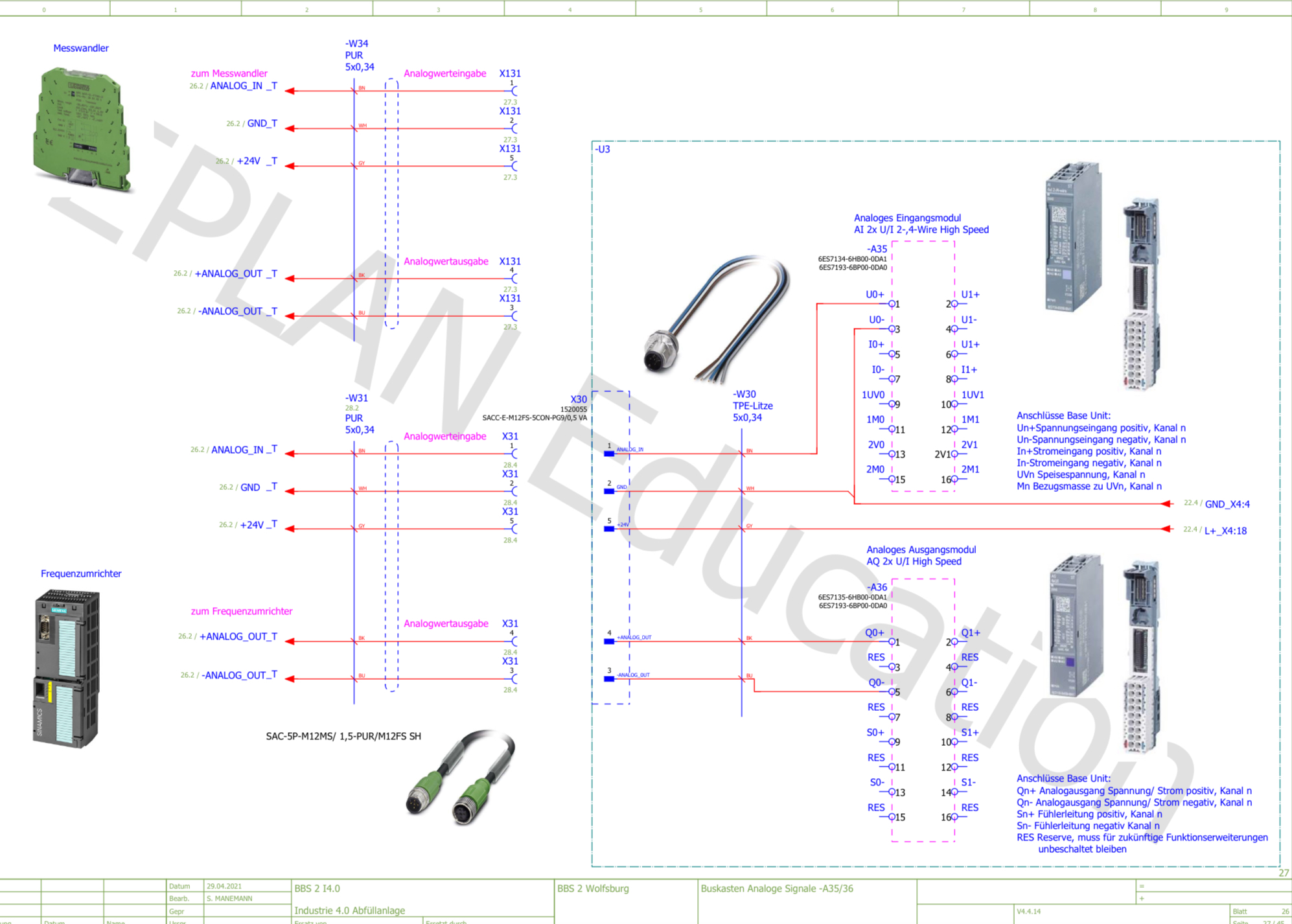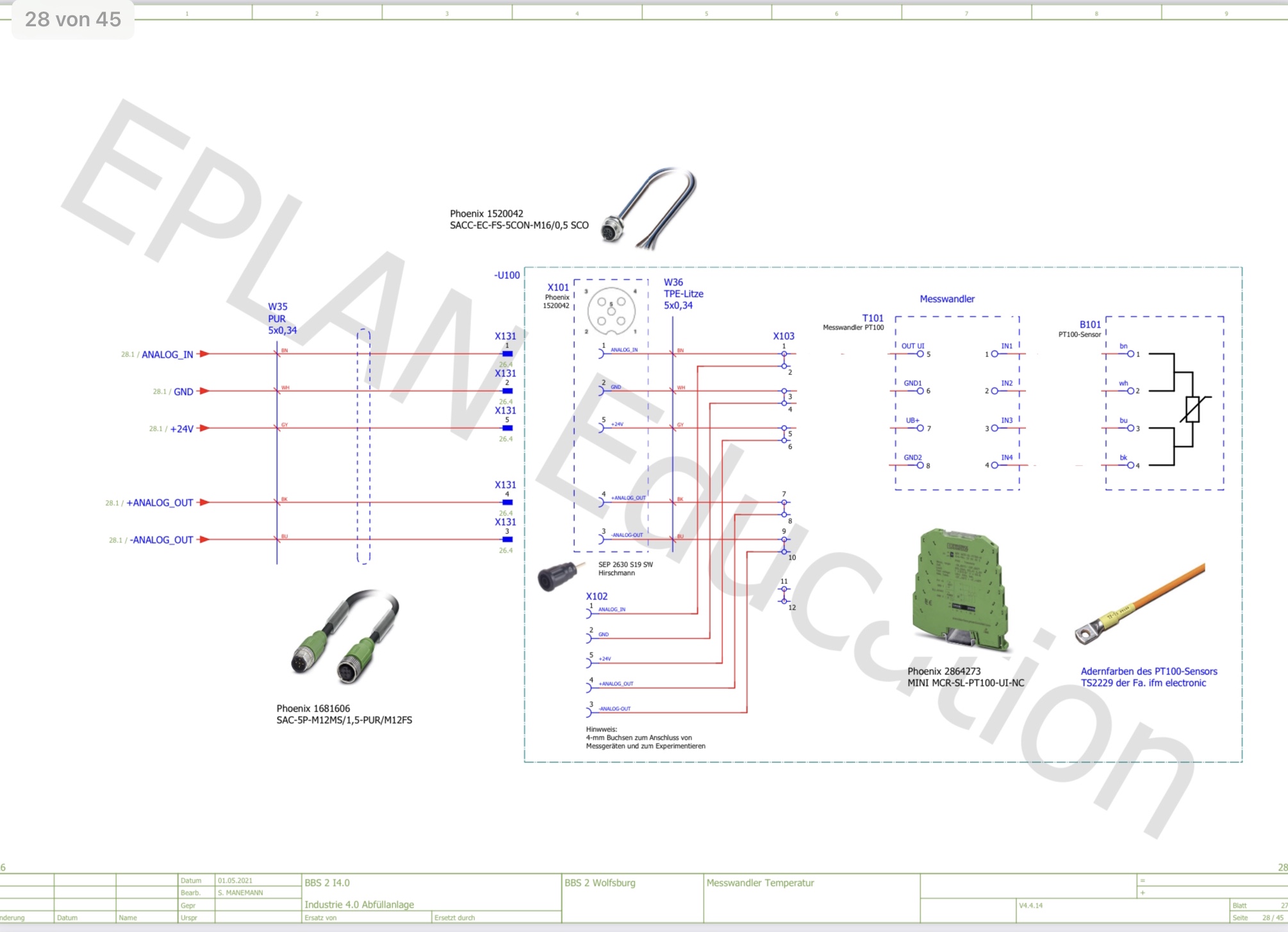 Zu letzt fehlt noch die Verdrahtung der Betriebsmittel auf dem Board. Die Aufgabe besteht darin, eine Verbindung von den Federzugklemmen zu dem Messwandler herzustellen und vom Messwandler zum PT100-Sensor. Dafür müsst Ihr euch Gedanken machen, wie die Verbindung erfolgen muss, um ein funktionierendes Board zu entwickeln. Überall dort, wo die Verbindungen fehlen, muss die Verdrahtung am Board selbst erfolgen.